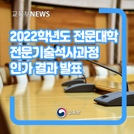 교육부(부총리 겸 교육부장관 유은혜)는 2022학년도 전문대학 기술석사과정(8개교, 13개 과정, 정원 176명 규모)을 12월 27일(월)에 최종 인가하였다.