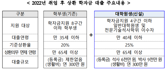 내년부터 ‘취업 후 상환 학자금 대출(ICL)’을 지원받을 수 있는 대학원생의 범위를 일반대학원의 석사학위 과정 또는 박사학위 과정, 전문대학의 전문기술석사학위 과정을 이수하는 사람으로 명시하였다.