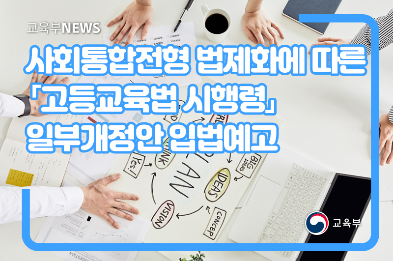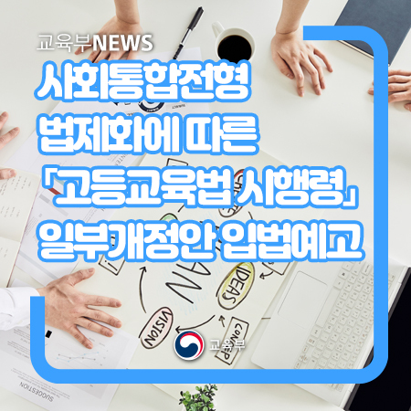 교육부(부총리 겸 교육부장관 유은혜)는 사회통합전형의 세부내용을 담은 「고등교육법 시행령」일부개정령안을 12월 28(화)일부터 내년 1월 17일(월)까지 20일간 입법 예고한다.
