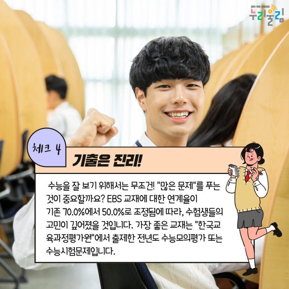 다양한 문제집이 있겠지만, 저는 그중에서도 한국교육과정평가원이 주관하는 6월, 9월 모의평가, 그리고 과거의 수능시험 문제지를 가능하다면 미리 자주 들여다보는 것을 추천합니다. 수능 출제는 평가원에서 하기 때문에 지난 연도의 기출 문제를 풀면서 평가원에서는 어떤 문제를 자주 출제하는지, 어떤 개념을 중시하는지 등 적응하는 것이 필요합니다. 물론 모든 개념을 다 이해하고 있어야 하는 것은 맞지만, 시험이 얼마 안 남은 시점에 집중과 선택이 필요할 때면 이 방법을 활용해보시면 좋을 것 같습니다. 그리고 단순히 문제를 풀었다고 해서 끝나는 것이 아니라 그 문제를 분석하는 것이 가장 중요합니다. 내가 기억하지 못했던 개념 정리가 있는지, 틀린 문제라면 왜 이 답이 오답인지 하나하나 분석하는 것 또한 기본개념을 확실히 내 것으로 만들고, 좀 더 다양한 문제를 풀 수 있는 또 다른 중요한 방법이랍니다.