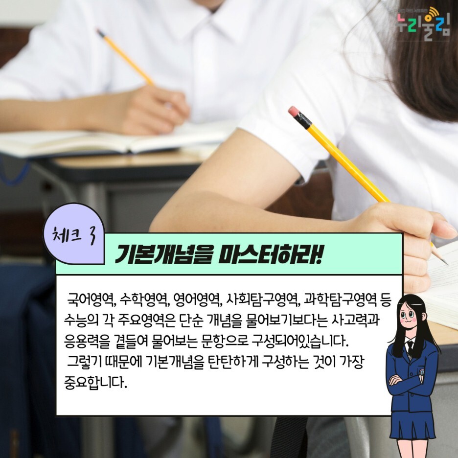 국어, 수학, 영어, 한국사, 사회탐구, 과학탐구, 직업탐구, 제2외국어 모든 과목 상관없이 시험을 치를 때 기본적으로 그 과목의 문제를 풀기 위해서 반드시 필요로 하는 ‘개념’이 있습니다. 수능 시험은 기초 개념부터 심화 개념까지 다 알고 있어야 풀 수 있다는 사실, 알고 계시겠죠?