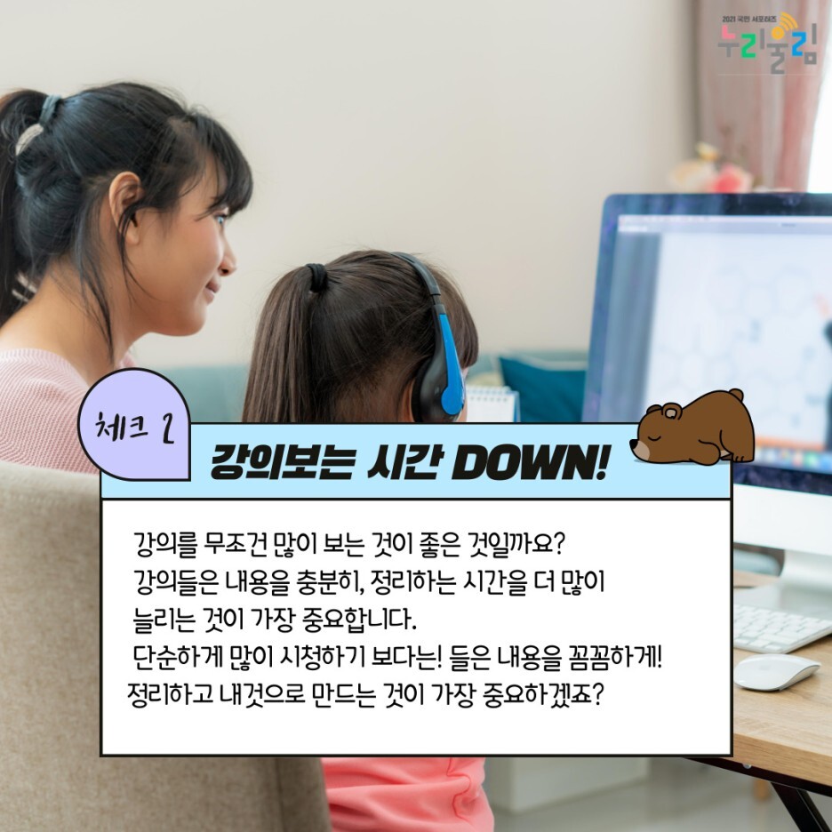고3이 되면 EBS 강의부터 사설 인터넷 강의까지 수험생들은 생각 이상으로 정말 다양한 인터넷 강의를 접하게 됩니다. 심지어 코로나19 이후에는 대면 수업보다는 비대면으로 듣는 수업도 많아졌죠. 그런데 아무리 훌륭한 선생님의 강의를 들어도 결국 완전히 내 것으로 흡수하지 못하면, 그 강의는 나에겐 의미 없는 강의가 됩니다. 따라서, 무조건 강의를 많이 보고, 시간을 많이 투자하면 성적이 오를 것이라는 생각은 버리고, 강의를 듣고 난 이후 즉, 강의 내용을 정리하고, 이해하는 시간에 더 많이 투자해야 한다는 점을 꼭 기억해주세요.