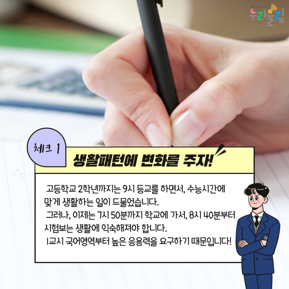 고등학교 3학년을 앞둔 지금부터는 수능 시험 시작인 8시 40분부터 공부하는 생활에 몸이 익숙해져야 합니다. 왜냐하면 1교시에 치르는 수능 국어 영역에서부터 학생들에게 높은 사고력과 응용력을 요구하기 때문입니다. 따라서, 1교시부터 바로 집중해서 문제를 풀 수 있도록 시험 시간보다 더 일찍 일어나 머리를 완전히 깨우고, 미리 준비하는 등 수능 시간에 맞춰 컨디션을 조절하고, 생활 습관을 만들어보면 좋겠죠?