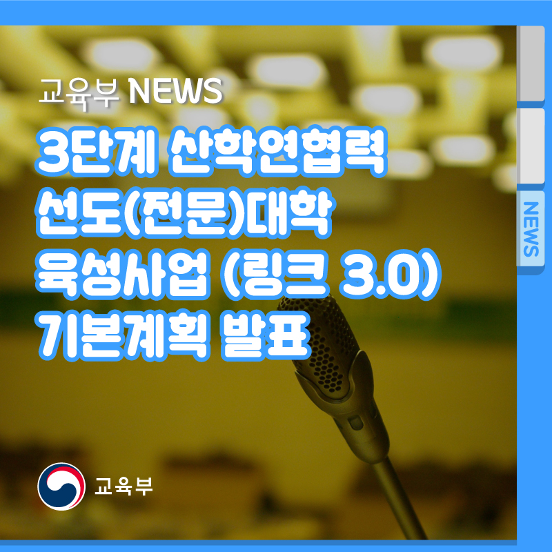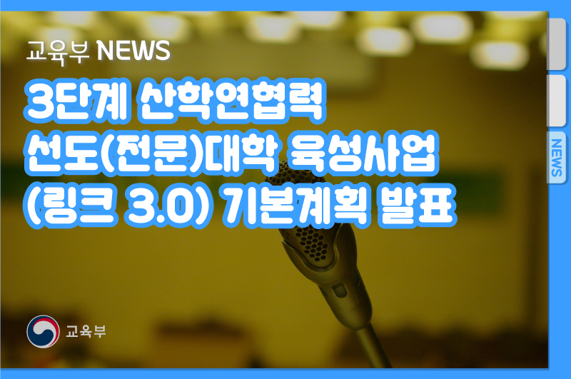 교육부(부총리 겸 교육부장관 유은혜)는 3단계 산학연협력 선도(전문)대학 육성사업(이하 ‘링크 3.0*’) 기본계획을 1월 13일(목)에 공고한다.
