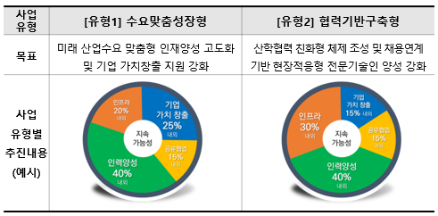 ‘수요맞춤성장형’은 산업계 및 미래사회 수요에 맞는 인력 양성 및 기업 지원 활성화를 목표로, 총 50개교 내외의 대학을 선정한다.