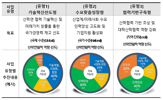 일반대는 기술기반 산학연협력 활동을 촉진하여 고부가가치를 창출할 수 있는 유형(기술혁신선도형)을 포함하고, 전문대는 실용기술인 등 산업체 맞춤형 인재양성 체계를 더욱 고도화할 수 있도록 하였다. 아울러, 산학연협력에 대한 잠재적 역량을 갖춘 후발 대학들이 산학연협력을 적극적으로 추진할 수 있도록 별도 지원 유형(협력기반구축형)을 신설하였다.