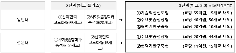 ◦ 3단계 링크(링크 3.0) 기본계획(시안) 공청회((일반대)2021.12.24., (전문대)2021.12.29.)