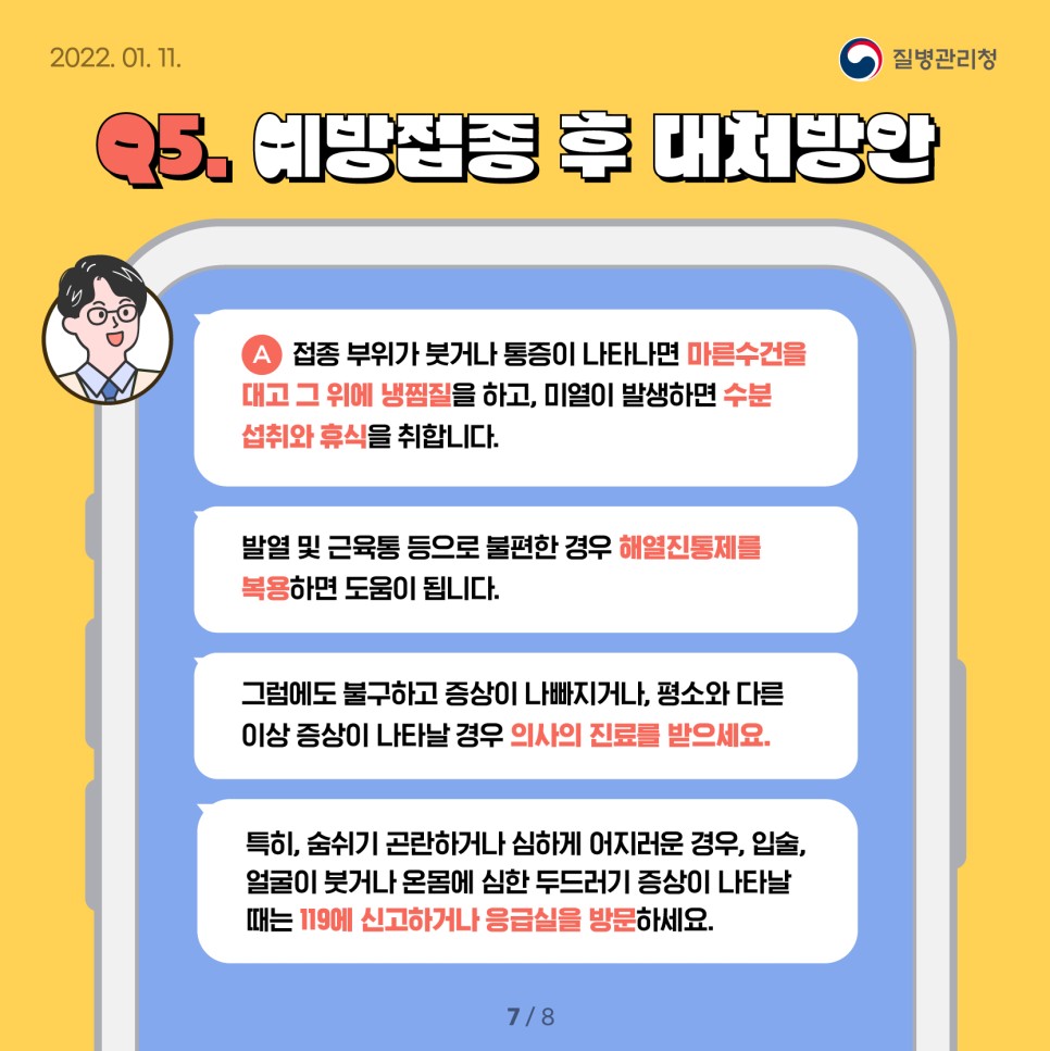 A. 접종 부위가 붓거나 통증이 나타나면 마른수건을 대고 그 위에 냉찜질을 하고, 미열이 발생하면 수분섭취와 휴식을 취합니다. 발열 및 근육통 등으로 불편한 경우 해열진통제를 복용하면 도움이 됩니다. 그럼에도 불구하고 증상이 나빠지거나, 평소와 다른 이상 증상이 나타날 경우 의사의 진료를 받으세요. 특히, 숨쉬기 곤란하거나 심하게 어지러운 경우, 입술, 얼굴이 붓거나 온몸에 심한 두드러기 증상이 나타날 때는 119에 신고하거나 응급실을 방문하세요.