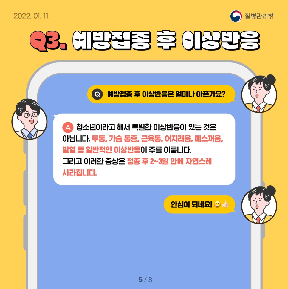 A. 청소년이라고 해서 특별한 이상반응이 있는 것은 아닙니다. 두통, 가슴 통증, 근육통, 어지러움, 메스꺼움, 발열 등 일반적인 이상반응이 주를 이룹니다. 그리고 이러한 증상은 접종 후 2~3일 안에 자연스레 사라집니다.