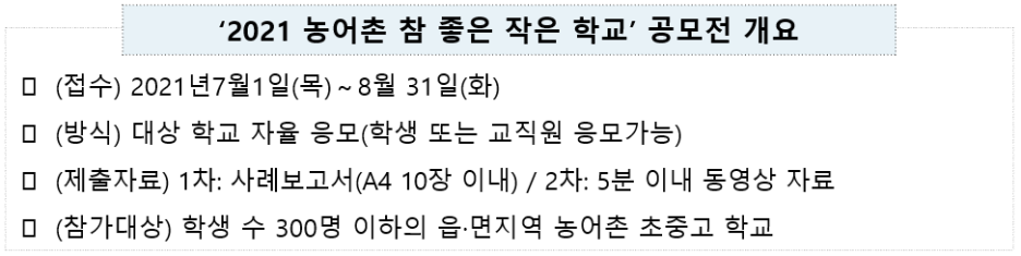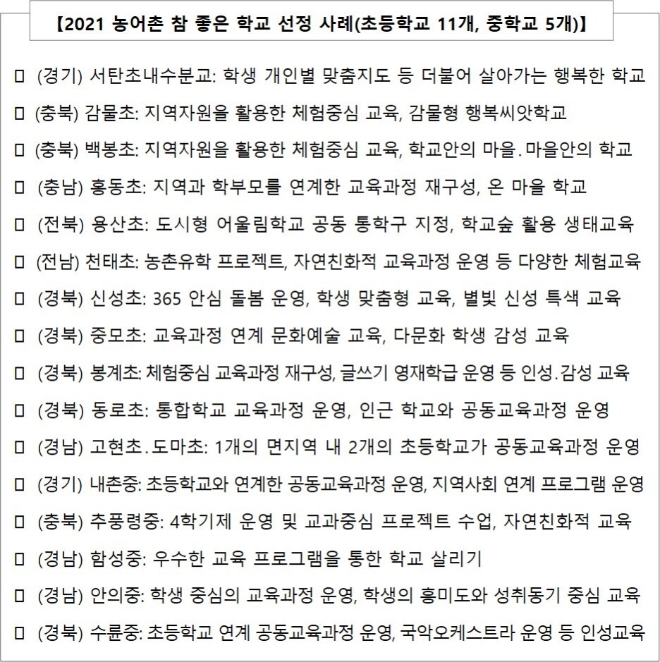 □ 교육부(부총리 겸 교육부장관 유은혜)는 「2021 농어촌 참 좋은 작은 학교」로 선정된