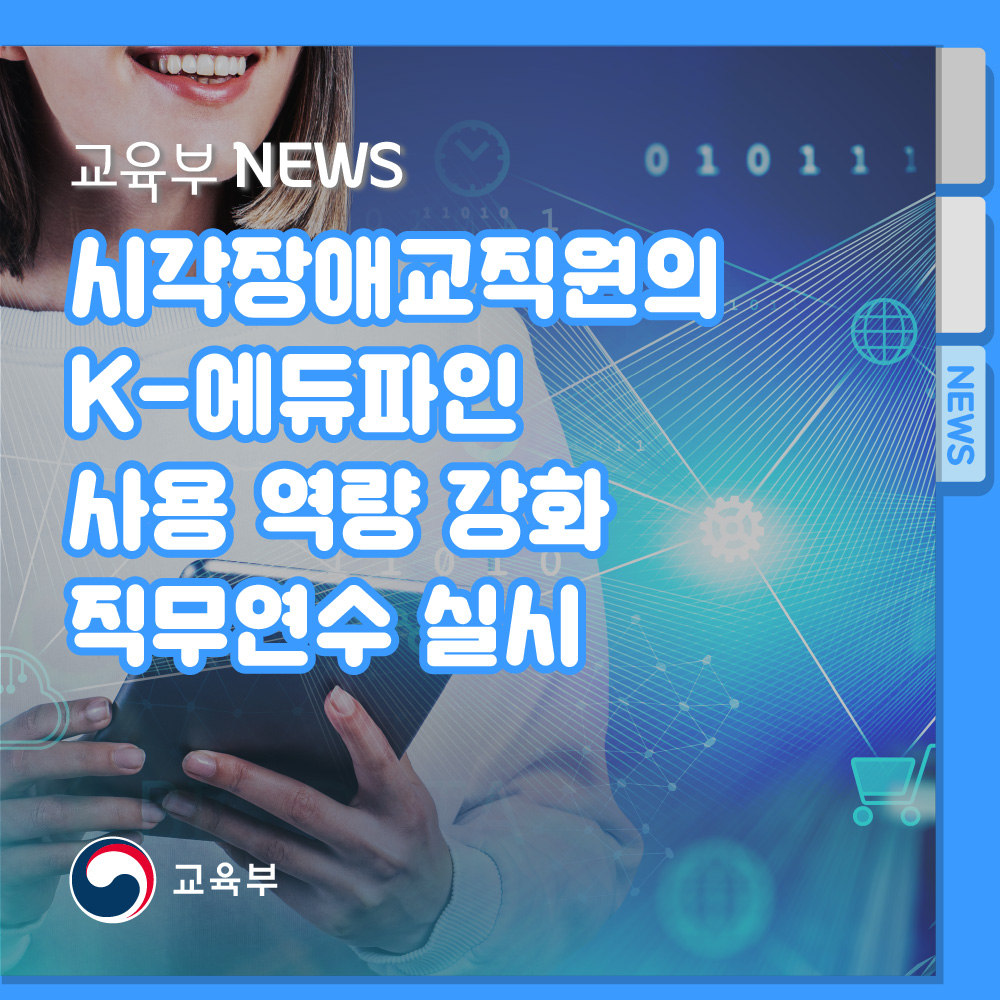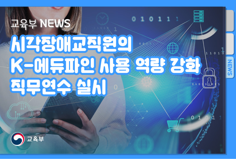 교육부(부총리 겸 교육부장관 유은혜)는 국립특수교육원(원장 이한우) 및 한국교육학술정보원(원장직무대행 신명호)과 협업하여 시각장애교직원을 대상으로, 화면낭독프로그램(스크린리더)*을 활용한 ‘케이(K)-에듀파인’ 활용 역량 강화 연수를 실시한다.