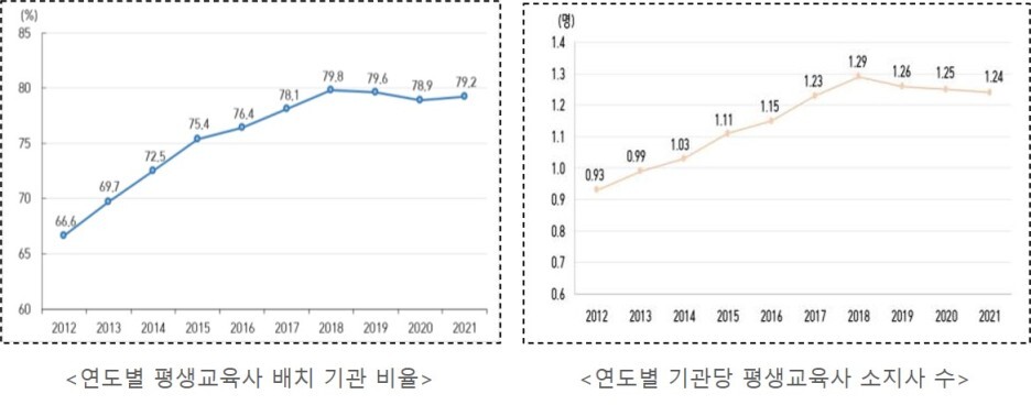기관당 평생교육사 자격증 소지자는 1.24명으로 지난해(1.25명)와 비슷한 수준으로 2012년(0.93명) 대비 약 1.3배 증가하였다.