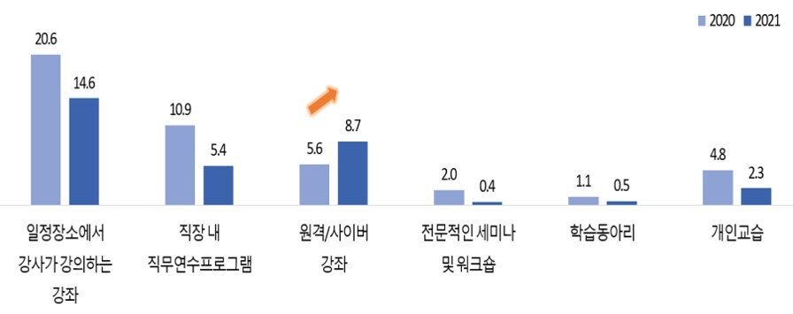 비형식교육 중 ‘원격·사이버 강좌’ 형태의 프로그램에 참여한 비율은 8.7%로 전년(5.6%) 대비 3.1%p 증가하였으며, 그 외의 형태에서는 모두 전년 대비 감소 추세로 비대면 형태의 학습이 증가한 것으로 나타났다.
