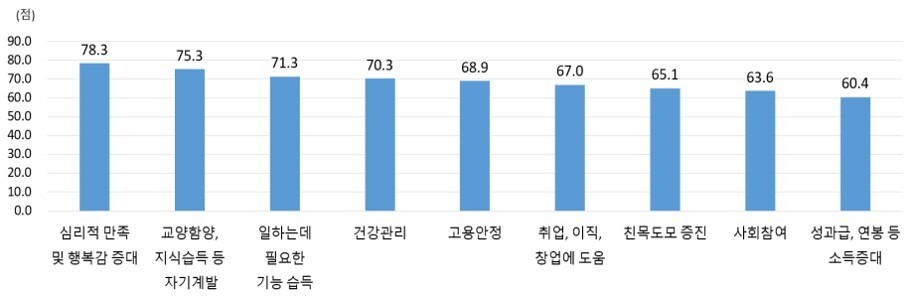또한, 우리나라 성인은 평생학습 참여를 통해 ‘심리적 만족 및 행복감 증대’ (78.3점), ‘자기계발’(75.3점), ‘업무에 필요한 기능습득’(71.3점)에서 높은 성과를 거둔 것으로 나타났다.