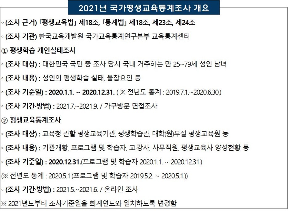 교육부와 한국교육개발원은 평생교육분야 정책 수립 및 연구 등에 활용하기 위해 매년 전국의 성인(2021년 9,905명)과 평생교육기관(2021년 4,493개)을 대상으로 조사를 실시하고 그 결과를 공표하고 있다.