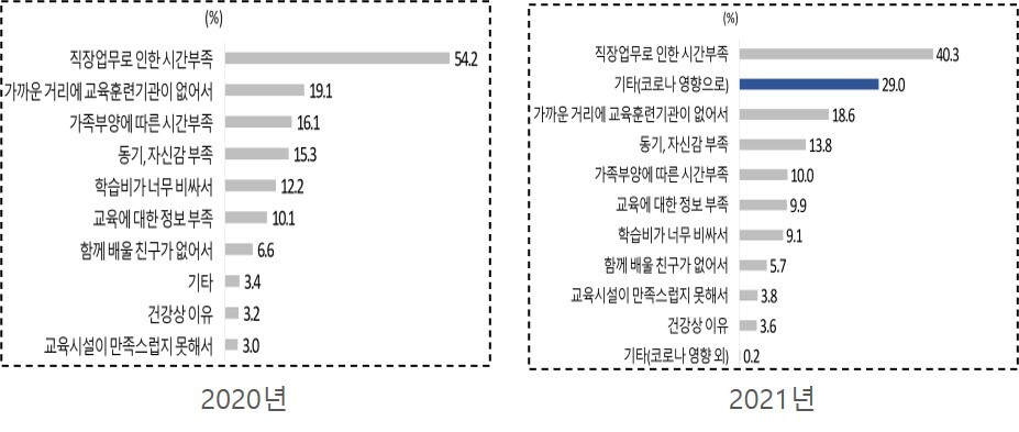 * ‘기타’ 응답은 29.2%로 전년(3.4%) 대비 약 9배 증가했으며 대부분 “코로나의 영향으로 평생학습에 참여하지 못했다”(29.0%)라고 주관식으로 응답