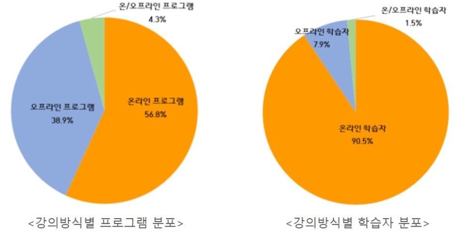 강의 방식별로 살펴보면, 온라인 학습자 수는 18,722,544명으로 전체의 90.5%를 차지하고, 전년(20,152,690명) 대비 7.1% 감소하였으며, 오프라인 학습자 수(1,639,940명)는 전년(4,103,398명) 대비 60.0% 감소하였다.