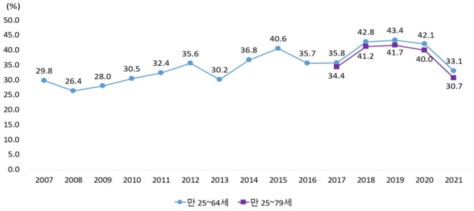 (평생학습 참여율) 우리나라 성인(만25~79세)의 평생학습 참여율은 30.7%로 성인 10명 중 3명이 평생학습에 참여한 것으로 나타났으며, 이는 전년(40.0%, 2020년 기준) 대비 9.3%p 감소한 수치이다.