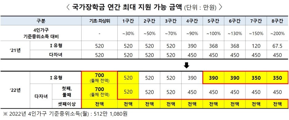또한, 학자금 지원 대상 선정의 합리성을 높이기 위해 2022학년도부터 다자녀 가구에는 소득인정액(월)에서 셋째 이상인 자녀 1인당 40만 원을 공제한다.