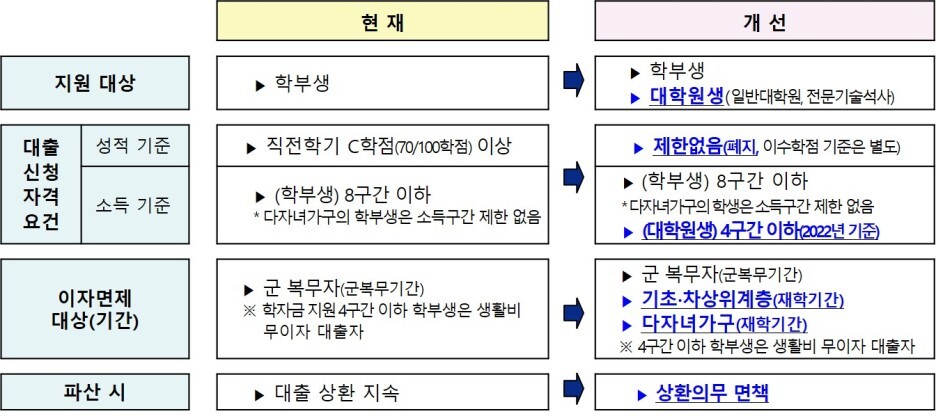 □ 취업 후 상환 학자금대출 성적기준을 폐지 및 대학원생까지 확대