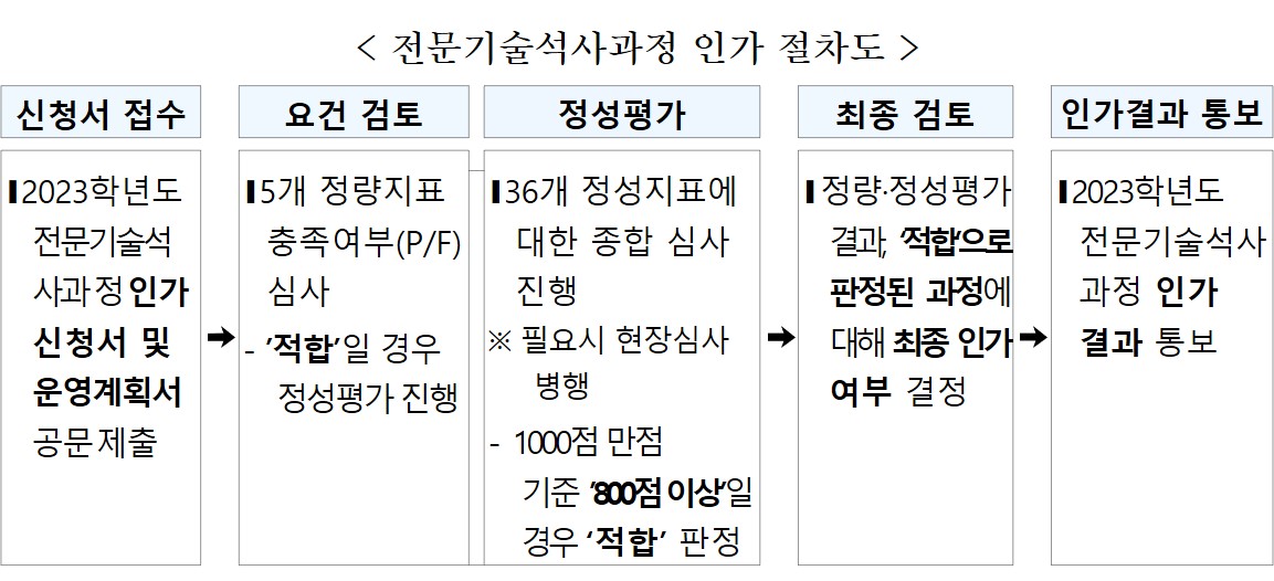 교육부는 2023학년도 전문기술석사과정 설치 인가를 위한 운영 계획서를 2월 28일(월)까지 접수하고, 최종 인가 여부는 6월 30일(목)까지 신청 대학에 통보할 예정이다.