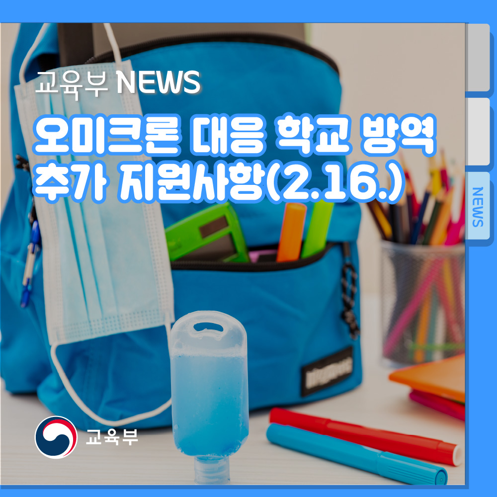 교육부(부총리 겸 교육부장관 유은혜)는 오미크론 대응‘2022학년 1학기 유․초․중등 및 특수학교와 대학의 방역 및 학사 운영방안(2.7.)’ 발표 이후 학교 방역의 안착과 업무 부담을 줄이기 위해‘학교 방역 추가 지원 방안’을 2월 16일(수) 발표하였다. 이번 방안은 새 학기 학교 방역 준비를 위한 추가 지원으로 학교의 방역 부담을 완화하고, 현장의 어려움을 사전에 해소하여 학교 방역체계를 조기에 구축할 수 있도록 중점을 두었다.