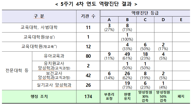 □ 5주기 4차 연도, 교원양성기관(총 114개교, 174개 기관) 역량진단 실시 및 결과(A~E 등급) 통보