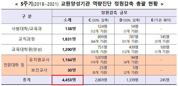 시(C) 등급은 교원 양성 정원의 30%, 디(D)등급은 교원 양성 정원의 50%를 감축할 예정이며,