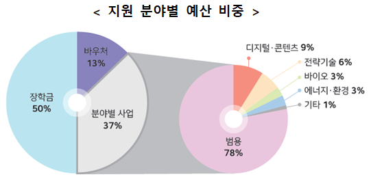 (지원 분야별) 분야별 지원 현황(장학금ㆍ이용권(바우처) 사업 제외)을 살펴보면, 분야를 지정하지 않거나 기관을 포괄적으로 지원하는 사업이 총 2.7조 원(78%)으로 대부분을 차지하고 있으며, 디지털ㆍ콘텐츠 분야가 0.4조 원(9%), 반도체, 배터리 등을 포함한 전략기술이 0.2조 원(6%), 바이오 분야와 에너지ㆍ환경 분야가 각각 약 0.1조 원(3%)으로 나타났다.