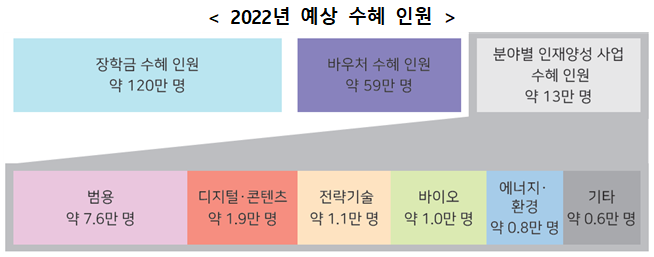 (예상 수혜 인원) 2022년 인재양성 사업 수혜자는 약 190만 명(대상 인원이 산출 가능한 112개 사업 대상)이며, 이 중 장학금 사업의 수혜 인원은 약 120만 명, 이용권(바우처) 사업의 수혜 인원은 약 60만 명이다.