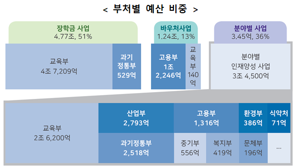 (부처별) 장학금 사업의 경우 교육부 예산(약 4.72조 원)이 대부분을 차지하고 있고, 이용권(바우처) 사업에서는 고용부 예산(약 1.24조 원)의 비중이 높았으며, 그 외 인재양성 사업의 경우도 교육부 2.62조 원, 산업통상자원부 0.28조 원, 과기정통부 0.25조 원 등 교육기관 일반재정지원사업과 부처 소관 기술·산업별 전문인재 양성사업 예산 등으로 구성되어 있다.