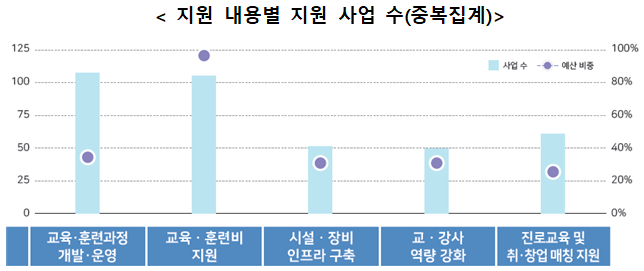 (지원 내용별) 내용별로는 △ 교육ㆍ훈련과정 개발ㆍ운영(107개), △ 교육ㆍ훈련비 개발(104개), △진로교육 및 취ㆍ창업 연결(매칭)(60개), △시설ㆍ장비 기반(인프라) 구축(50개), △교ㆍ강사 역량 강화(49개) 순으로 지원 사업 수가 많은 것으로 나타났으며, 학습자의 경제적 부담을 줄이고 분야별로 특성화된 교육과정을 개발하는 데 지원을 집중하고 있다.