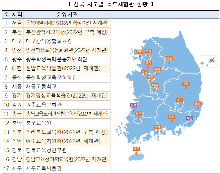 □ 2022년에는 전국 어디서나 독도를 생생하게 만날 수 있도록 전국 17개 시도별 독도체험관 구축을 완성할 계획이다.