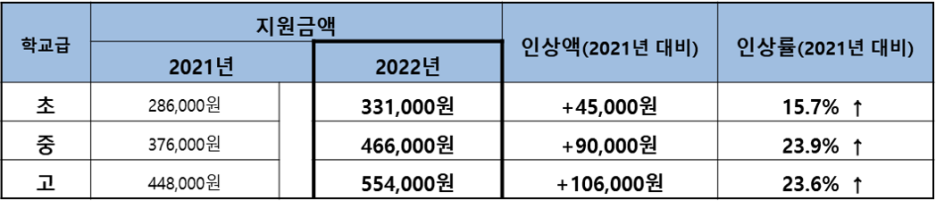 □ 초·중·고 교육급여 지원액 전년 대비 평균 21.1% 인상