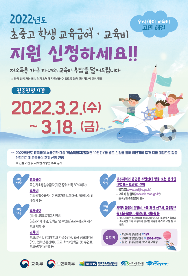 2022년도 초중고 학생 교육급여·교육비 지원 신청하세요! 본문