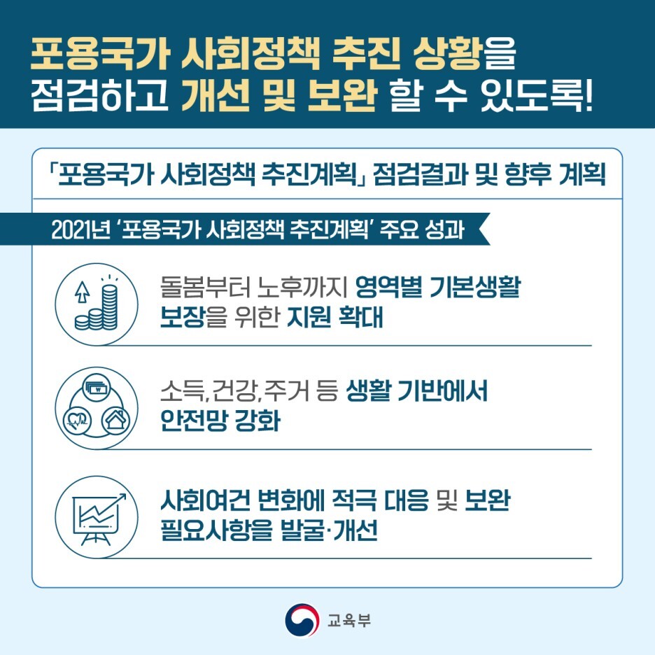| 2022년 교육부 업무계획, "모두의 더 나은 삶을 위해" 부처 간 긴밀한 협력을 통해 신뢰받는 포용사회를 구현하겠습니다. (0) | 2022.01.17 |