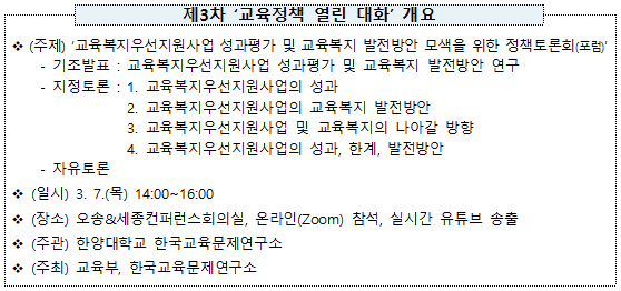 ‘교육정책 열린 대화’는 미래교육 방향 정립 등을 위해 연속 기획으로 마련되어 지난 2월 23일(수)(주제 : 산학연협력), 2월 28일(월)(주제 : 고등교육) 진행된 바 있으며, 이번 제3차 열린 대화는 ‘교육복지우선지원사업 성과평가 및 교육복지 발전방안 모색’을 주제로 진행된다.