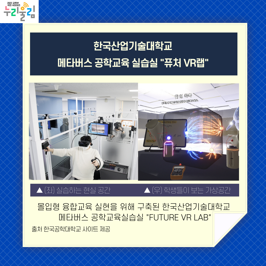 한국산업기술대학교는 메타버스 실습수업을 통해 현실에서 불가능한 것들을 보여주는 기술적인 능력과 상호작용이 거의 전 세대를 아울러서 교육 목적으로 충분히 활용 가능하다고 느끼게 되었고, 현재 활발한 교안 회의를 통해 새로운 실습형 메타버스 강의를 연구하고 있다고 합니다. 더불어 메타버스 실습실에서는 첨단 기기를 다룬 반도체 공정까지 체험할 수 있는데요, 산업 공정 체험과 직관적인 학습이 모두 가능한 메타버스 실습은 공학 교육에 큰 활력을 불어넣을 예정이라고 하니 기대가 됩니다!