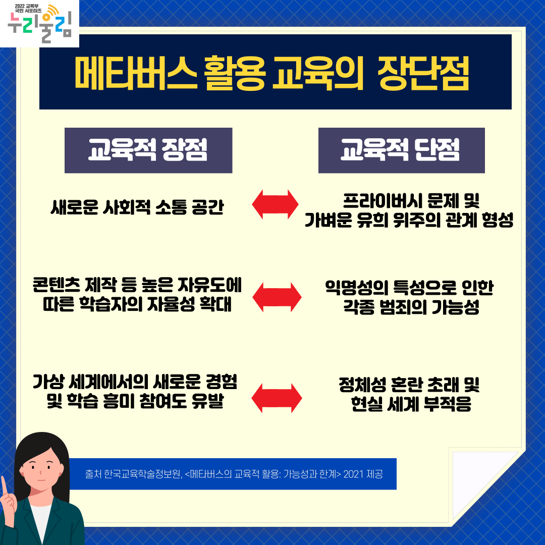 메타버스의 교육적 효과와 긍정적인 활용 가능성에 대한 기대만큼, 우려가 있는 것도 사실입니다. 한국교육학술정보원 <메타버스의 교육적 활용: 가능성과 한계>에서는 메타버스의 특성에 따라 발생할 수 있는 문제들을 다루었는데요, 메타버스 속 가상의 정체성으로 맺어지는 사회적 연결이 현실 세계보다 가볍게 이루어질 수 있다는 점과 개인의 프라이버시 문제 발생, 익명성에 따른 범죄 노출 가능성 등을 제시했습니다. 또한, 메타버스 속 세계가 정체성이 확립되지 않은 학생들에게 현실의 '나'와 가상의 '나' 사이에서의 정체성 혼란을 야기하고 현실 세계 부적응을 유발할 수 있다는 점도 지적했습니다.
