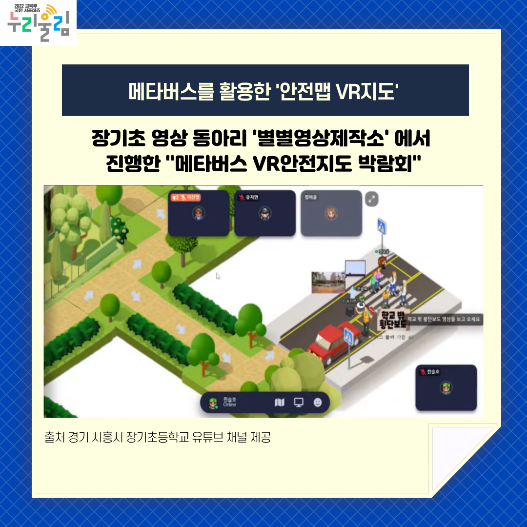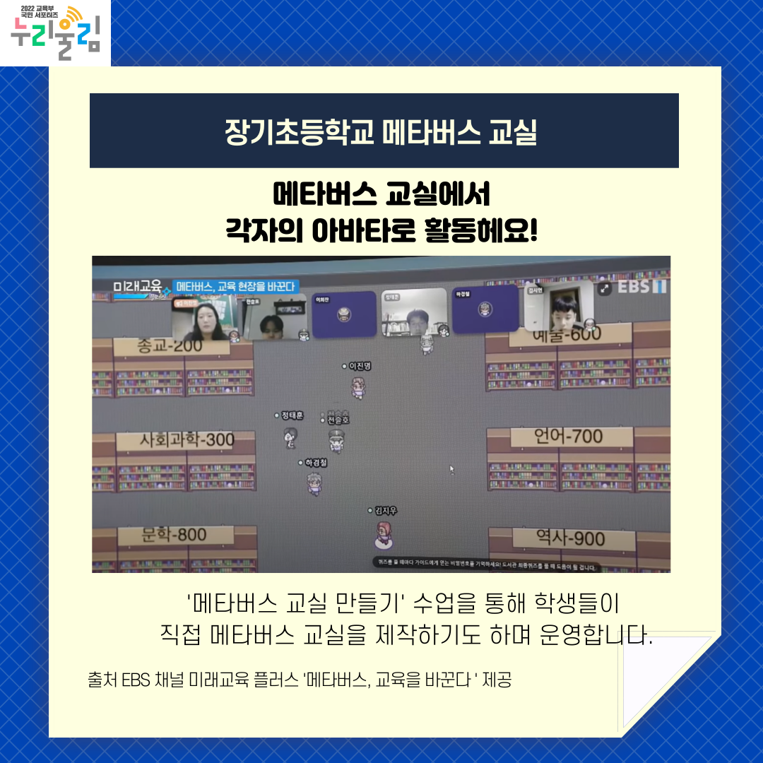 장기초등학교 학생들에게 메타버스 교실은 더욱 특별한 의미가 있는데요, 메타버스 속 등장하는 모든 공간들은 학생들이 직접 작은 아이콘들을 배치하여 만든 가상 공간이라고 합니다. 온라인 수업 시간에 '메타버스 교실 만들기' 수업을 진행한 선생님들의 노력 덕분에 현재는 학생들이 직접 메타버스 공간을 제작하고 운영하며 적극적으로 활동에 참여합니다. 최근에는 메타버스를 활용한 '안전맵 VR지도'를 제작하는 프로젝트를 진행하며 메타버스와 현실을 연결짓는 교육을 진행하고 있다고 합니다.