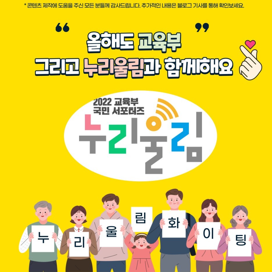 콘텐츠 제작에 도움을 주신 모든 분께 감사드립니다. 2022 누리울림 발대식의 생생한 현장이 궁금하시다면 아래 영상으로 확인하세요!