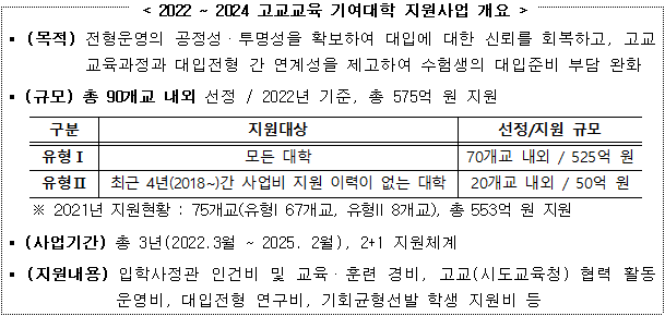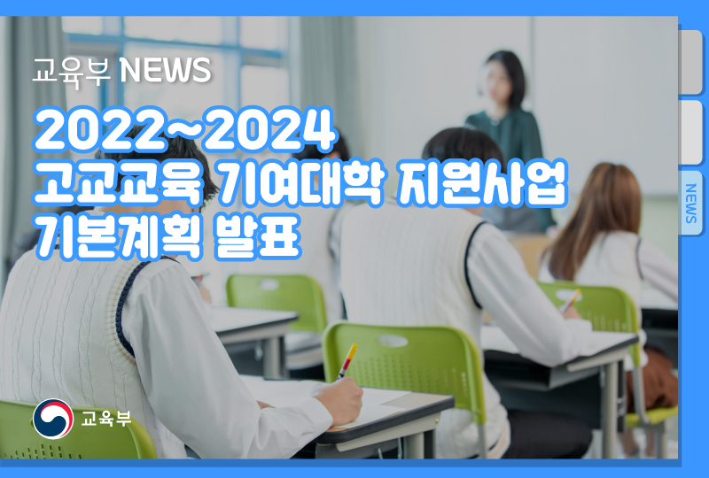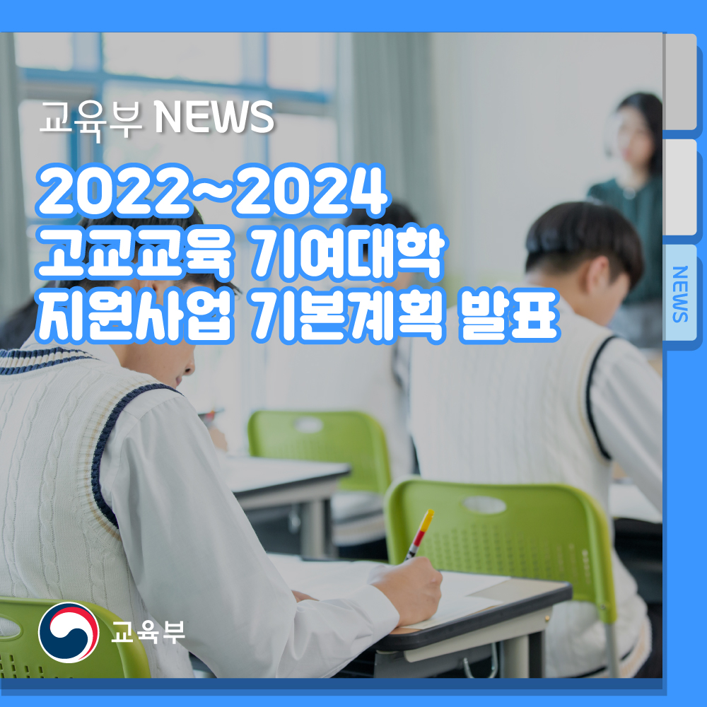 교육부(부총리 겸 교육부장관 유은혜)는 ‘2022~2024 고교교육 기여대학 지원사업 기본계획’을 3월 17일(목)에 확정·발표하였다.