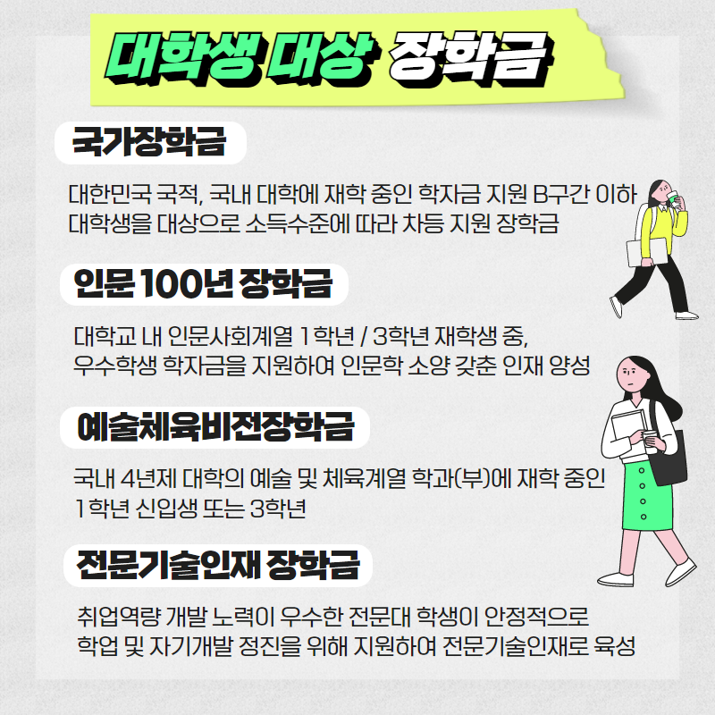 다음은 대학생 대상으로 운영되는 장학금에 대해서 몇 가지 소개해드릴 건데요! 총 4가지 제도로 국가장학금, 인문 100년 장학금, 예술체육비전장학금, 전문기술인재 장학금에 대해서 알아보도록 하겠습니다!