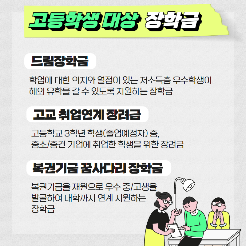 생각보다 고등학생을 대상으로 한 장학금 제도가 꽤 많죠? 학업에 의지를 가진 우수학생들이 많이 지원해서 다들 좋은 혜택을 누리셨으면 좋겠네요!