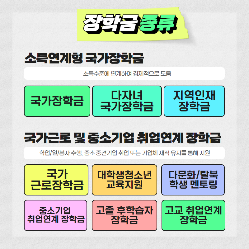 국가근로장학금, 대학생 청소년 교육지원사업, 다문화/탈북학생 멘토링, 중소기업 취업연계 장학금, 고졸 후 학습자 장학금, 고교 취업연계 장려금으로 이루어져 있는 제도입니다. 학업과 일, 봉사활동 수행을 통해서 또는 중소·중견기업 취업(창업) 또는 기업체 재직 유지를 전제로 지원받을 수 있는 장학금입니다.