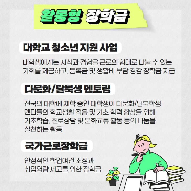 다음은 성적과 관련 없이 활동을 통해서 받을 수 있는 활동형 장학금을 소개할 텐데요! 크게 대학교 청소년 지원 사업, 다문화/탈북한 멘토링, 국가근로장학금이 있습니다.