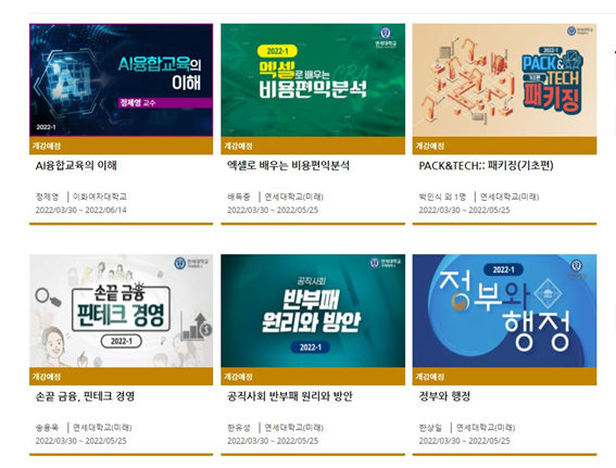 K-MOOC처럼 각 대학교에서도 일반강의를 일반인에게 제공하고 있습니다. 그중 한 내용을 떠올리며 K-MOOC가 유용할 수 있다는 사실을 다시 상기할 수 있었는데요. 한정적인 시간과 여유, 금전적 부담을 지고 빠르게 어려운 사회진출 시기를 돌파해야 하기 때문에 일상이 경쟁인 시대에서, 젊은이들은 예측 가능성을 확실히 하고 적은 부담으로 최선의 결과를 내야 합니다. 그렇기에 활용성이 높은 공인된 온라인 교육제도 K-MOOC가 특히 이 시기 청년에게 중요한 방법이 되지 않을까 생각하며 글을 마칩니다.