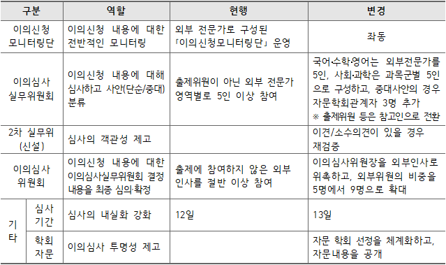또한 교육부의 ‘수능 출제 및 이의심사제도 개선안’을 충실히 적용하여, 출제 오류를 방지하고, 객관적이고 투명한 이의심사를 진행한다([부록4] 참조).