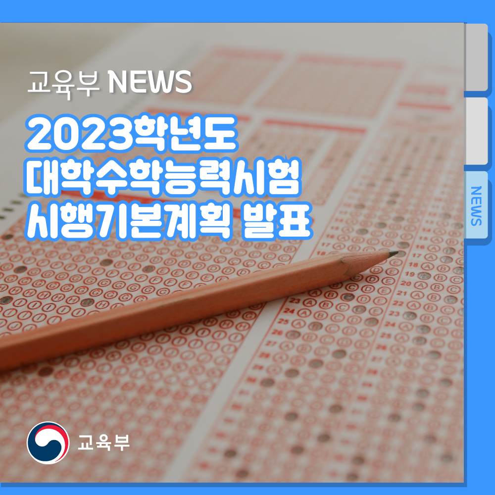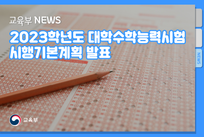 한국교육과정평가원(원장 이규민)은 2022. 11. 17.(목)에 실시되는 2023학년도 대학수학능력시험 시행기본계획을 2022. 3. 22.(화)에 다음과 같이 발표하였다.