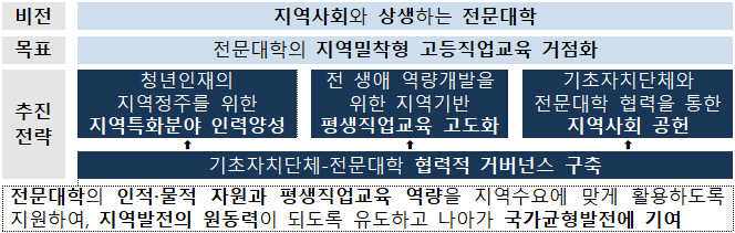 「고등직업교육거점지구 사업 기본계획」은 전문대학이 기초자치단체와 협력하여 지역 중장기 발전목표에 부합하는 지역특화분야* 인재양성, 지역 내 평생직업교육기능 강화 등을 수행하도록 지원하기 위한 것이다.